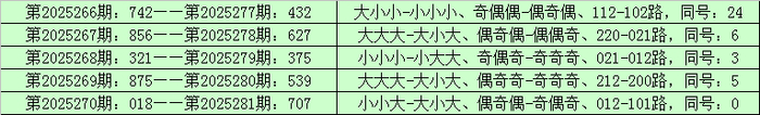 统计陈设三已开出的奖号发现,在畅达5期(第2025266期-第2025270)奖号为:742-856-321-875-018。